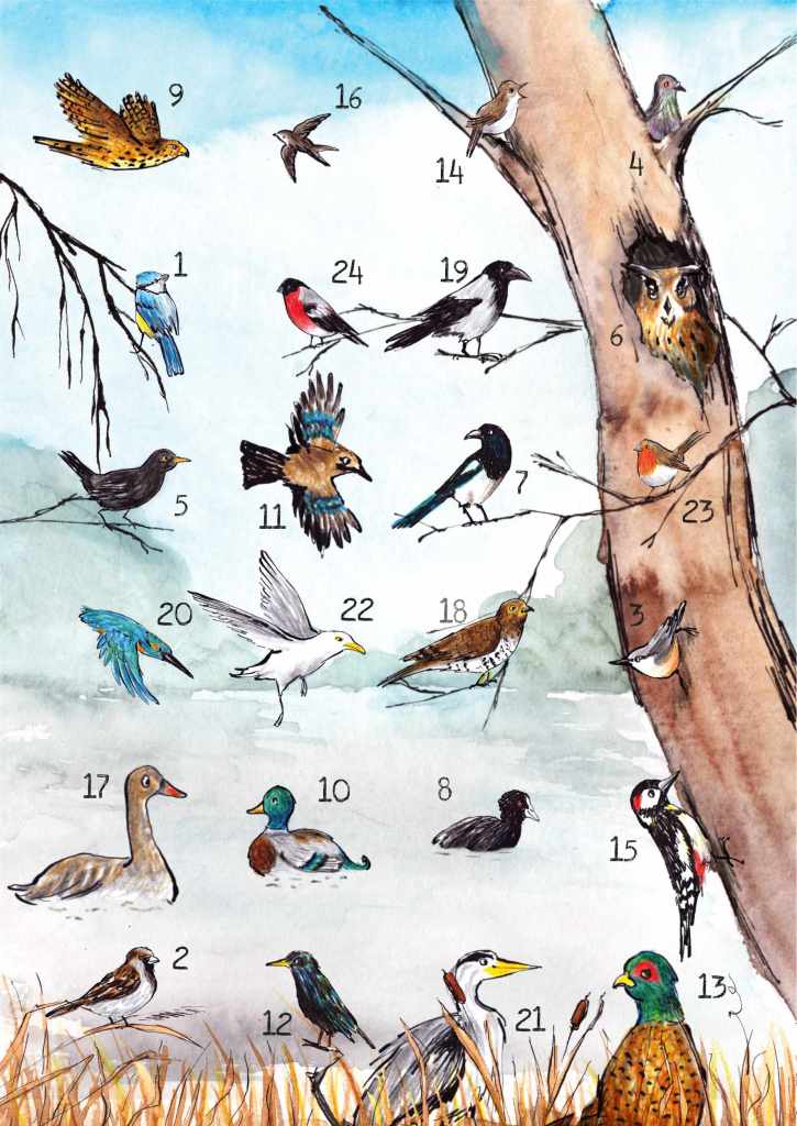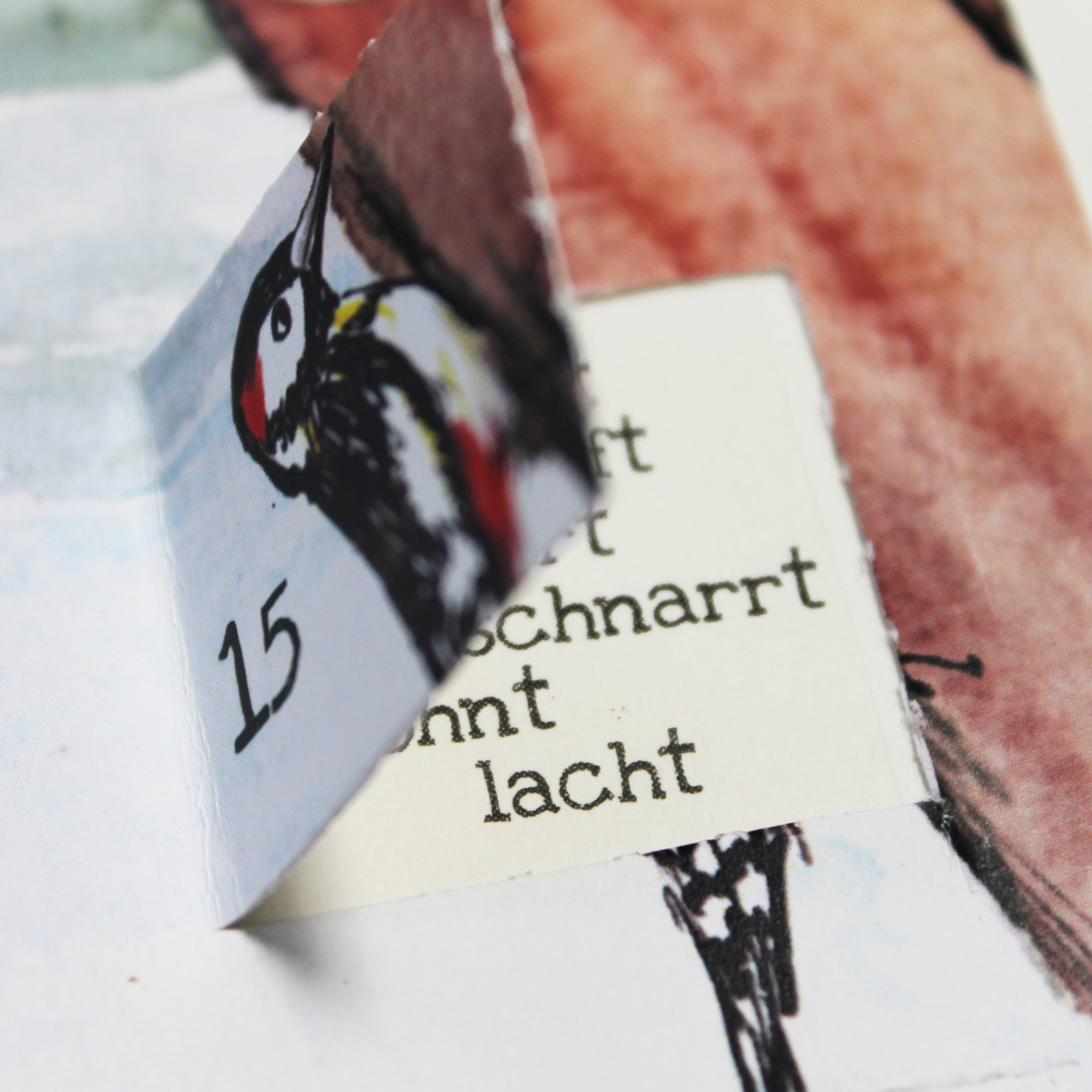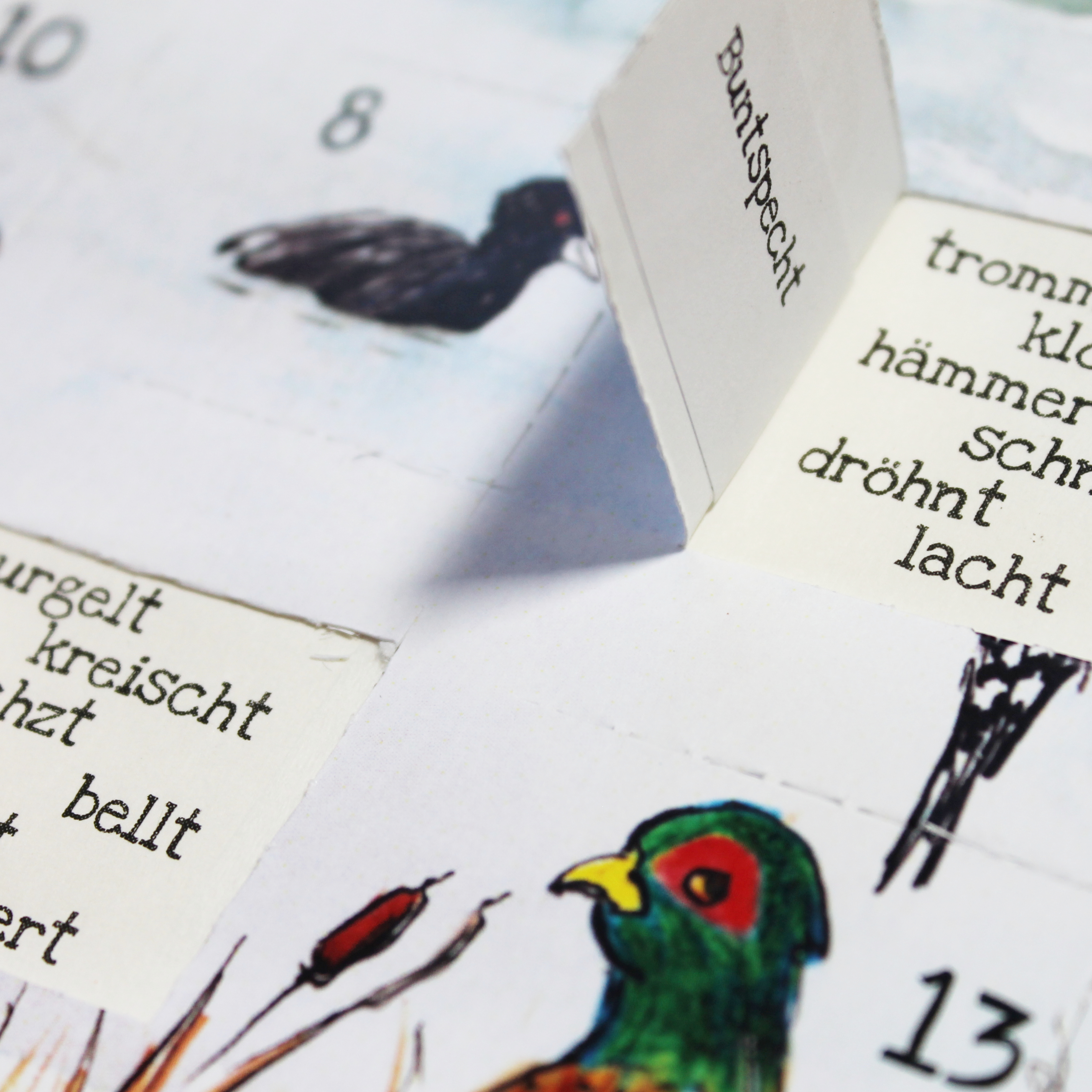 This is an advent calendar project I started in the summer, but I did not make it before the end of November to be able to print. Behind each of the little doors there are the name of the bird and the sounds they make. As a resource I used a dictionary of bird sounds “Singt der Vogel, ruft er oder schlägt er?” by Peter Krauss. It’s a wonderful reading anyhow, so I enjoyed working on this calendar.