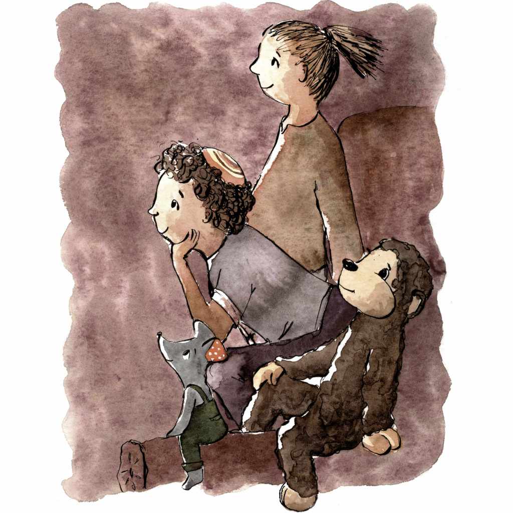 Here is a scene from the book with children and their favorite stuffed animals watching TV. I neither have a TV set nor a sofa at home, so I even needed to make a small research to figure out how to make the scene look naturally.