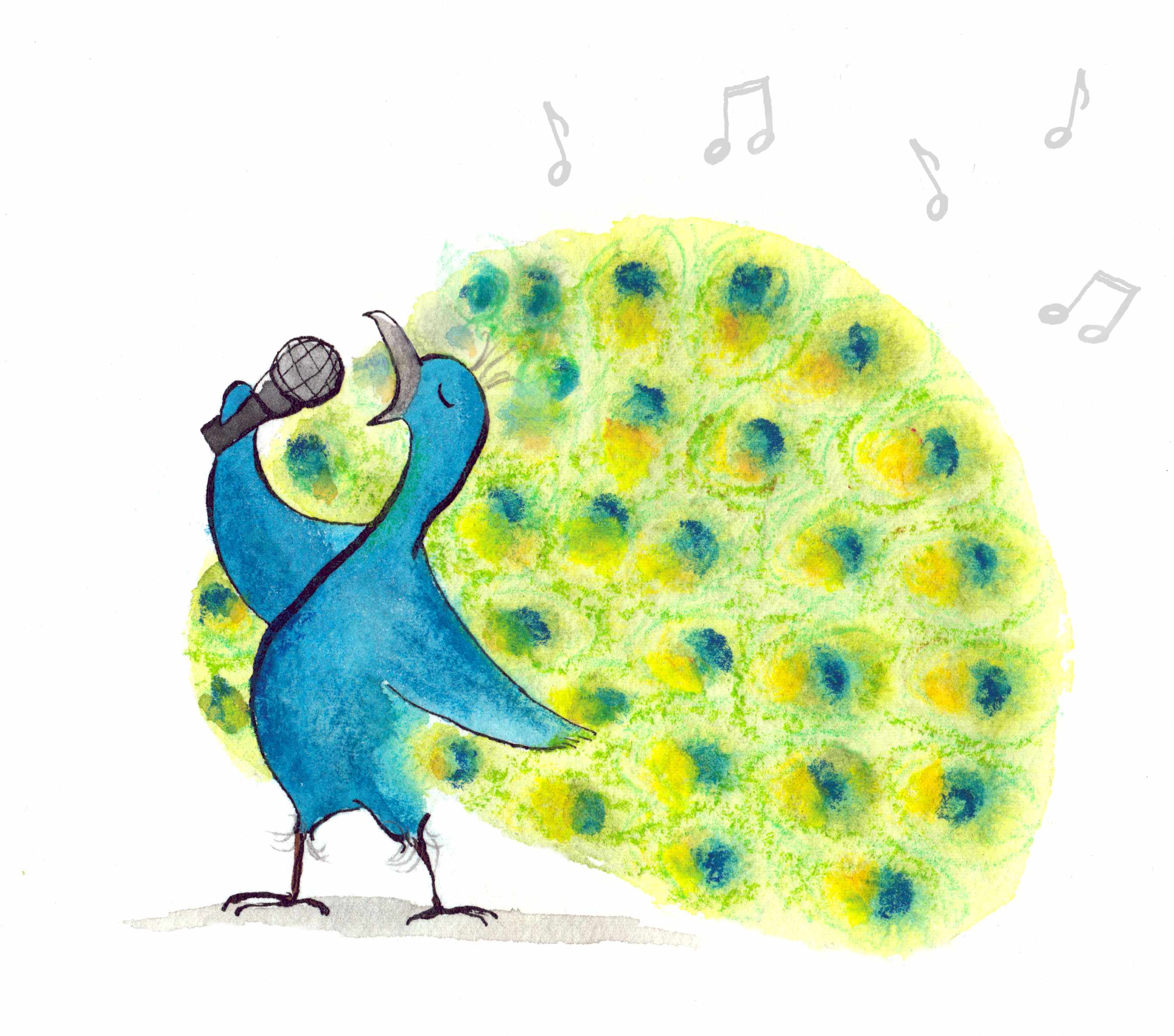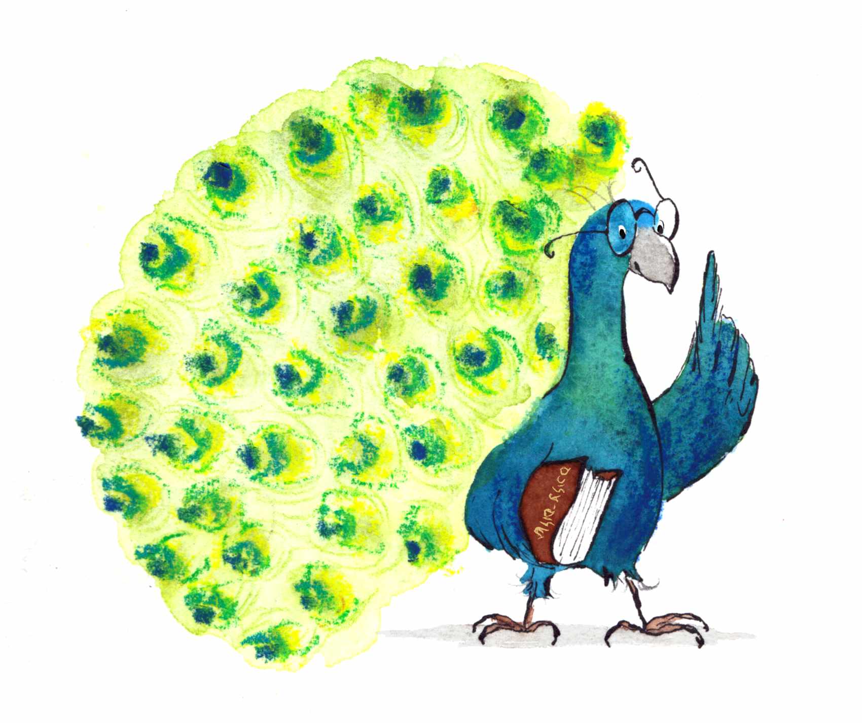 The best work for me is to combine Yiddish and illustration. Here is another experience designing a series of postcards and a logo for the club dedicated to the Yiddish culture in Hamburg. I used the first letter of Salomon Birnbaum’s name, shin, as a base for a logo, formed it as a peacock, a pave, with a crown, used on the letter shin in manuscripts. The peacocks on the postcards represent the activities organized by the club: lectures, concerts, postcard circles and trips.